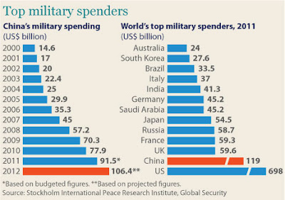 По сводкам ЦРУ Китай в разы увеличил военный бюджет на 2013 год, что составит 503 миллиарда долларов (военный бюджет Китая в 2012 году составил официально 106 миллиардов долларов - не официально 190 миллиардов долларов) сообщает The Wall Street Journal со ссылкой на ежегодный доклад Министерства обороны США.