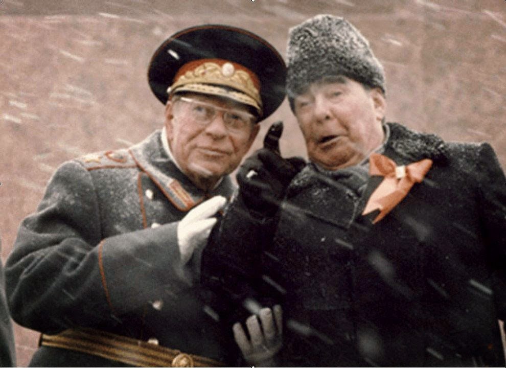 Министр обороны СССР Дмитрий Устинов и Генеральный секретарь ЦК КПСС Леонид Брежнев на трибуне Мавзолея Ленина 7 ноября 1982 года.